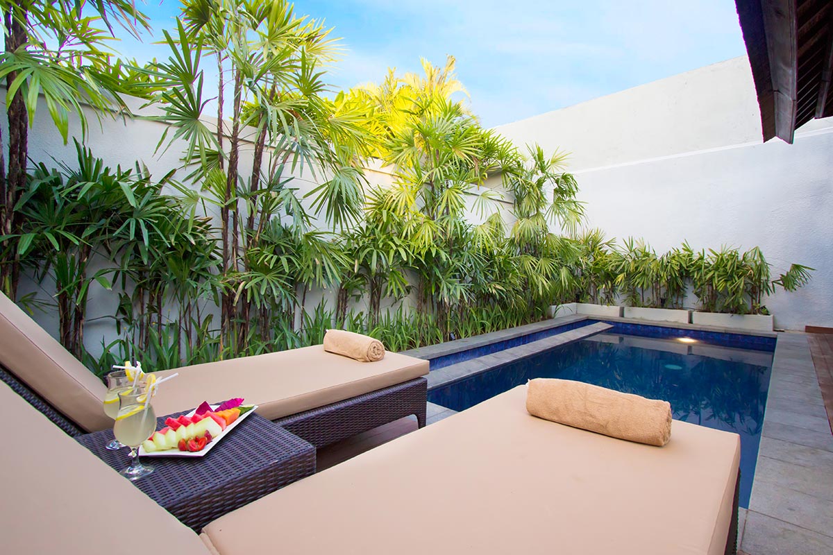 Holidaying at Serene is the smart way to experience the tropical lifestyle. Serene Lotus is modern in design with its open air living space looking out to your private pool. Our trained staff are waiting to provide service as only the Balinese can do. Enjoy your breakfast cooked by your private chef before heading out to explore Seminyak and beyond. The bedroom with double bed is connected to an indoor outdoor bathroom with a raindrop shower head for bathing. This intimate villa is perfect for singles or a couple.